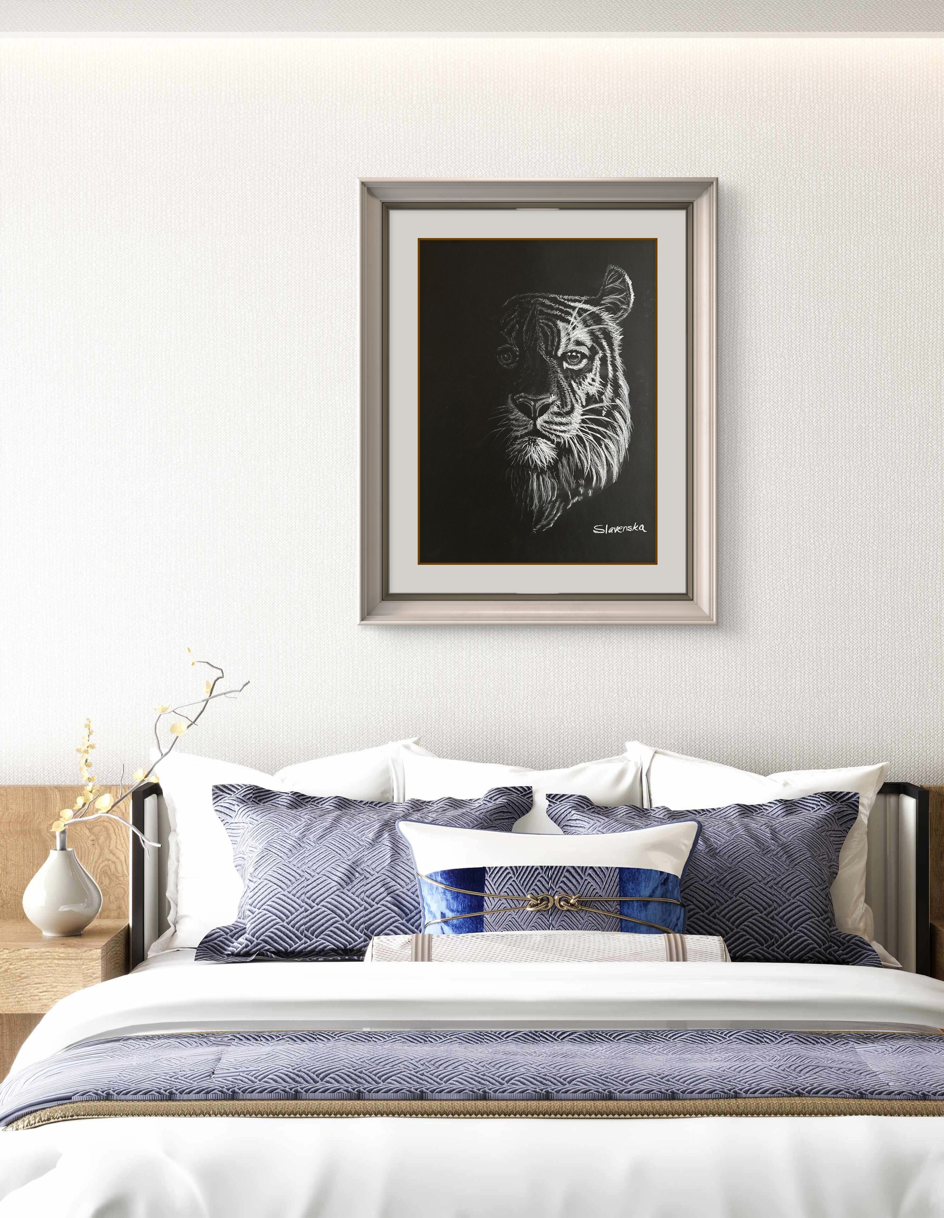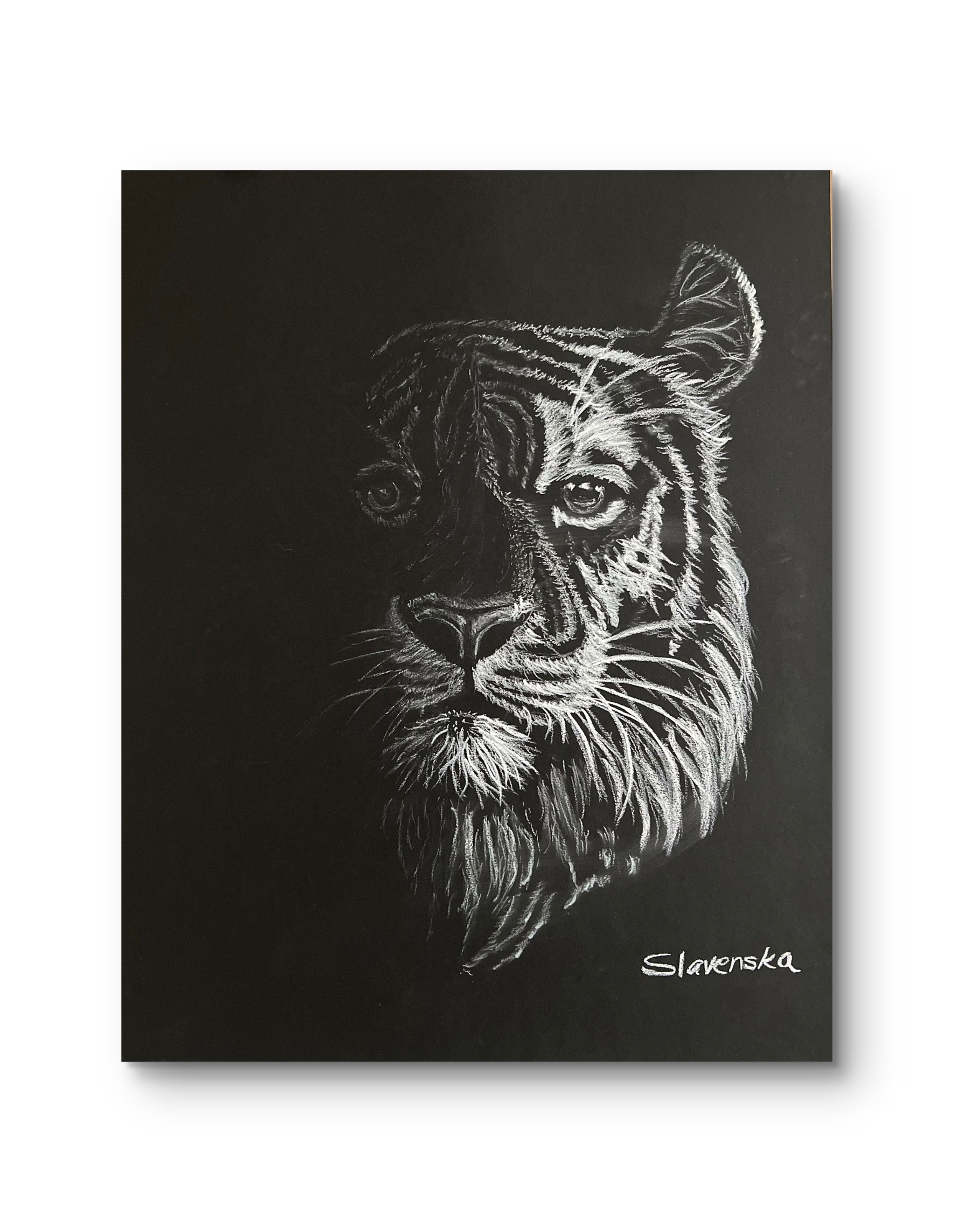 With poised strength emerging from pure darkness, Shadow King reveals the quiet authority of a tiger illuminated only by light itself. Drawn with a white china marker on deep black paper, this minimalist portrait captures the essence of the wild through expressive linework and intentional restraint. The stark contrast brings focus to the animal’s piercing gaze, honouring both its power and its elegance.